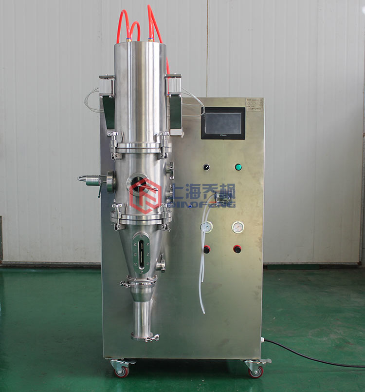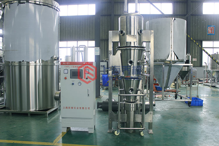 粉狀物料投入料斗密閉容器內(nèi),由于熱氣流的作用,使粉末懸浮呈流化狀循環(huán)流動,達(dá)到均勻混合,同時噴入霧狀粘結(jié)劑潤濕容器內(nèi)的粉末,使粉末凝成疏松的小顆粒,成粒的同時,由于熱氣流對其作高效干燥,水份不斷蒸發(fā),粉末不斷凝固,引過程重復(fù)進(jìn)行,形成理想的,均勻的多微孔球狀顆粒,在容器中一次完成混合,造粒,干燥三個工序。